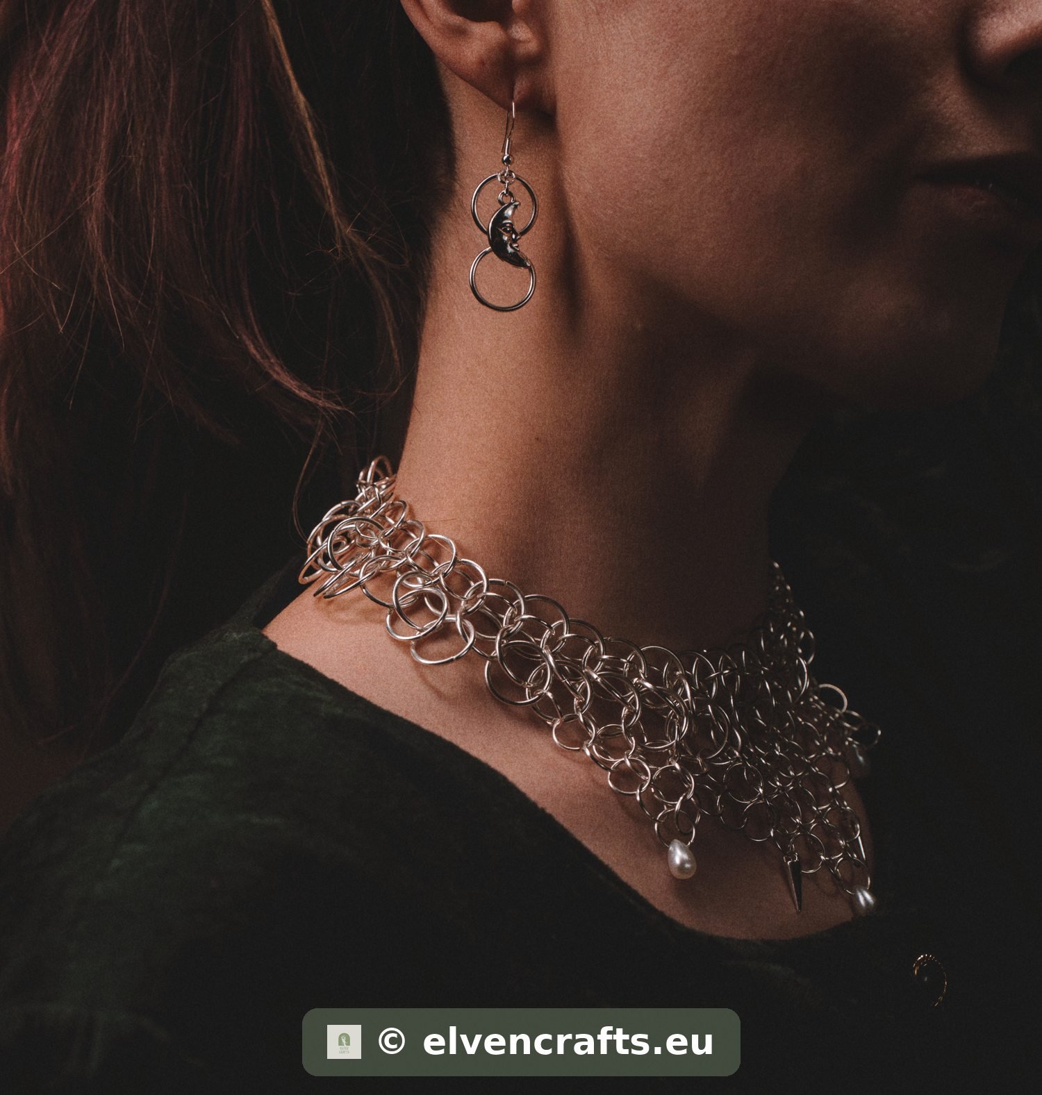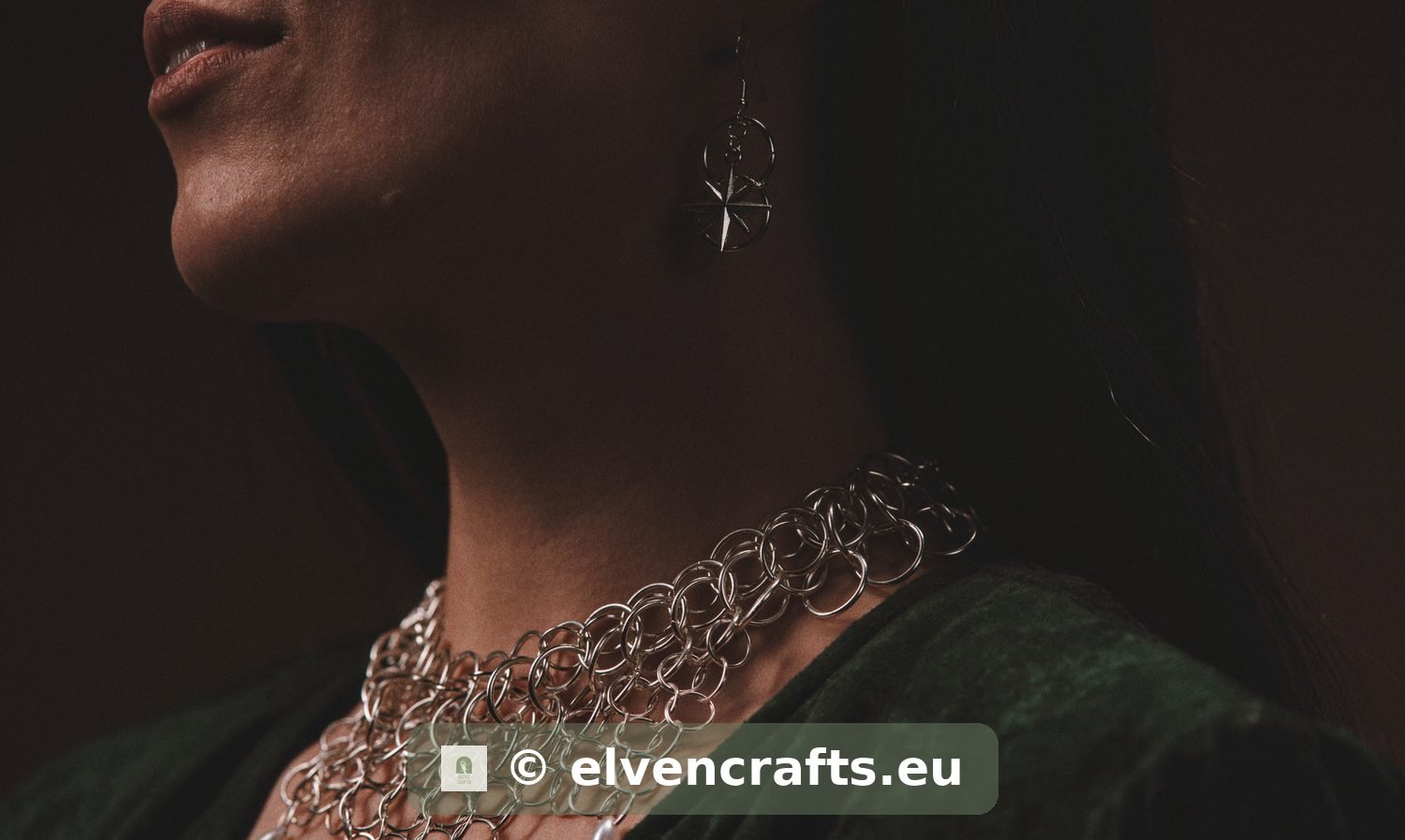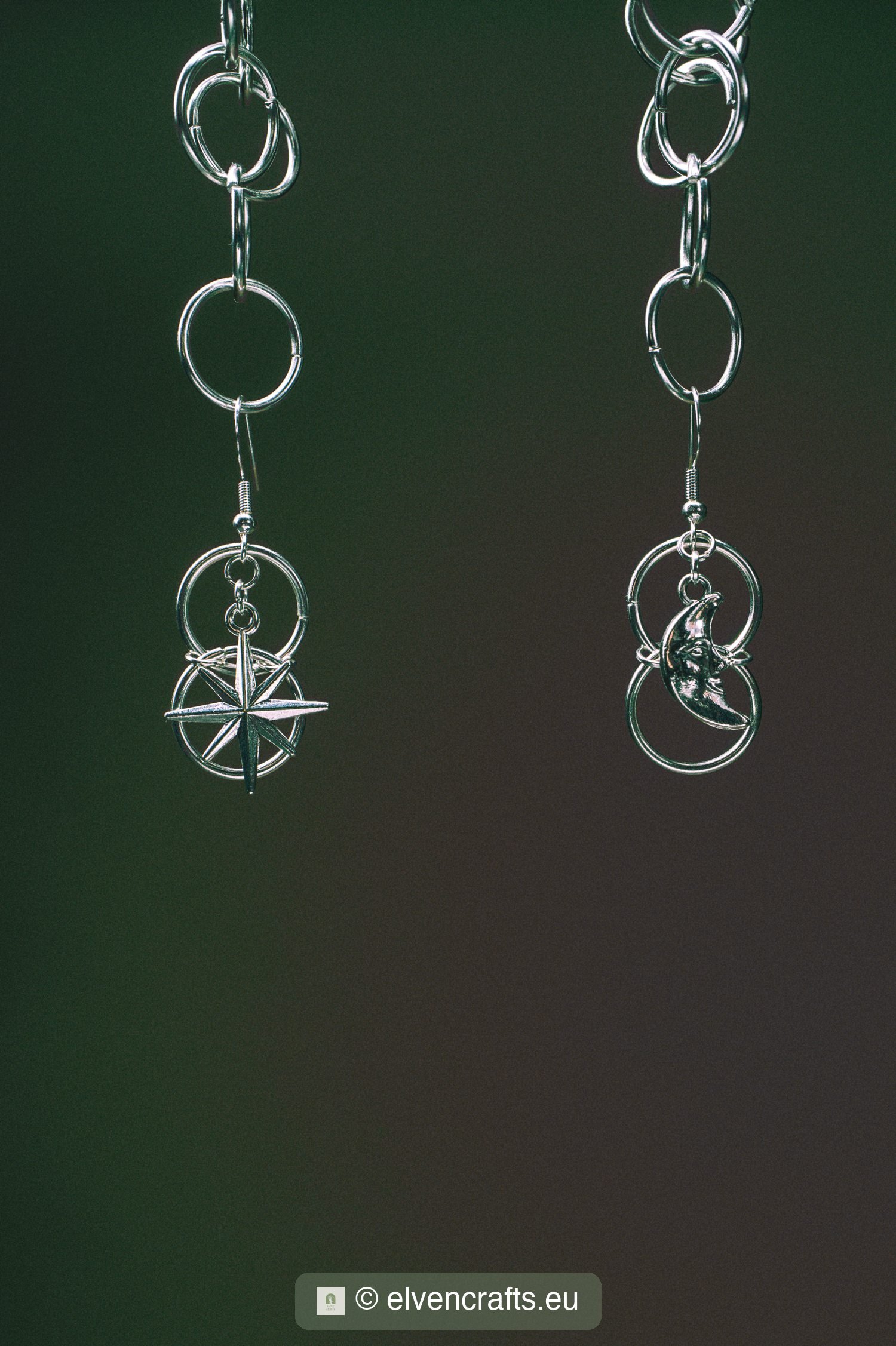 Delicate stainless steel earrings woven in European 4-in-1 chainmail. Each earring features a celestial charm — choose the crescent moon or eight-pointed compass star. The open ring weave catches light with every movement. 925 sterling silver ear hooks. Handmade in Finland.